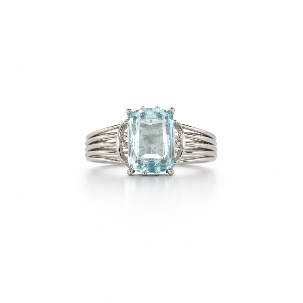 Anillo elaborado en oro blanco, diseñado para destacar una delicada piedra central de aguamarina de 1,8 quilates. Su engaste realza la transparencia y el suave tono azul de la piedra, aportando equilibrio y armonía visual. La estructura del anillo presenta líneas definidas y terminaciones pulidas. Con un peso total de 6,5 gramos, ofrece elegancia, comodidad y presencia refinada.