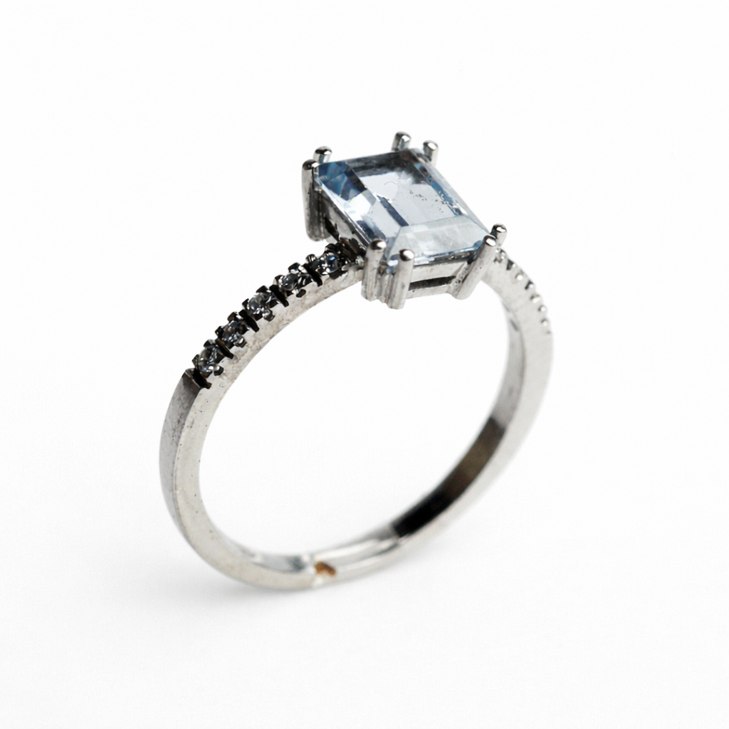 Anillo cintillo elaborado en platino de 3 gr, diseñado con una delicada Aguamarina central que aporta luminosidad y frescura. El anillo incorpora diamantes en corte brillante cuidadosamente engastados, realzando el diseño sin restar protagonismo a la piedra principal. Su confección hecha a mano destaca por la precisión de sus terminaciones y su equilibrio entre elegancia, ligereza y comodidad, convirtiéndolo en una pieza ideal para uso diario o para ocasiones especiales.