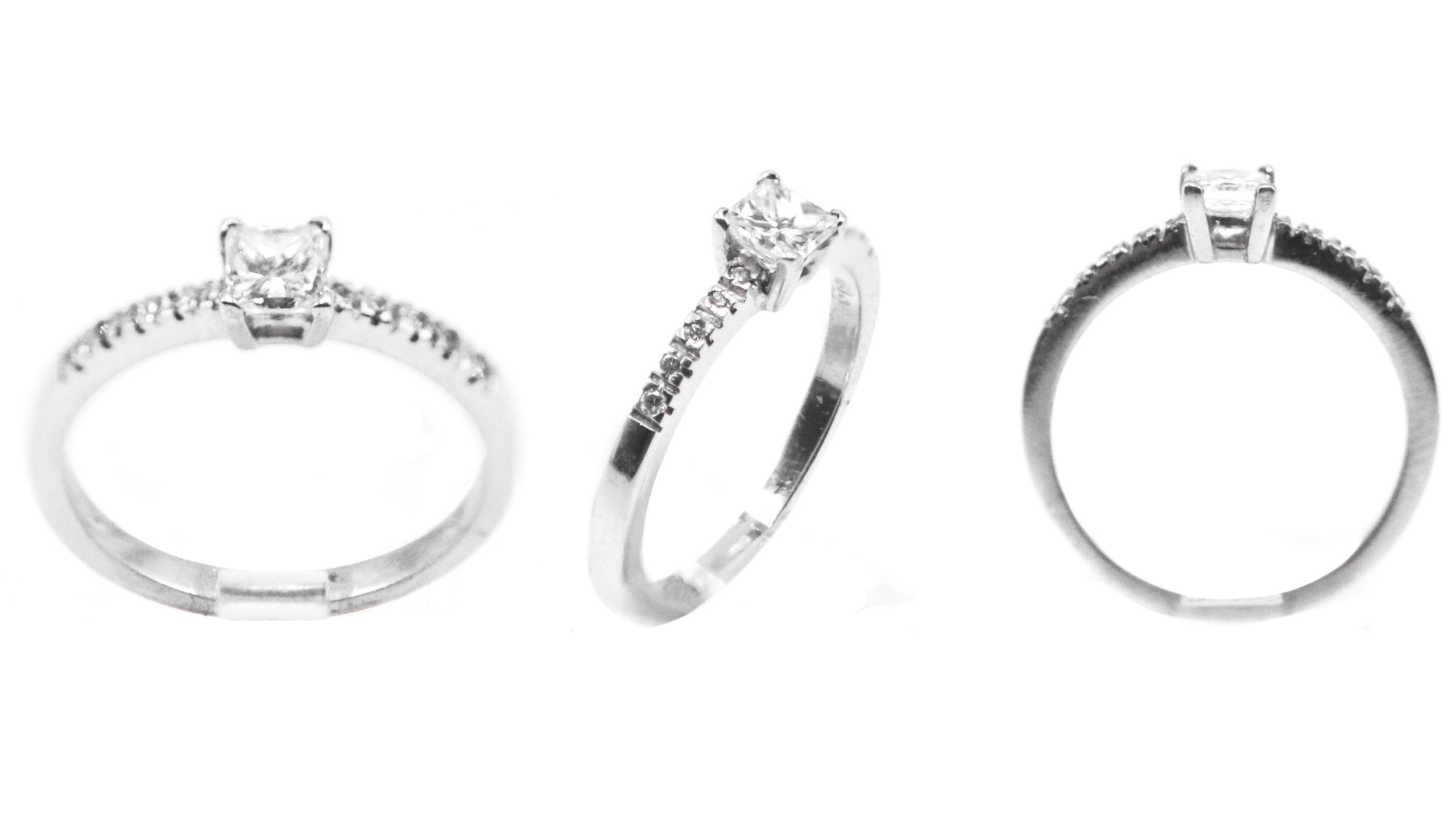 Este anillo cintillo de oro blanco es la definición de la elegancia moderna. En su centro, un diamante corte princesa brilla con la majestuosidad de un amor verdadero, mientras que diez diamantes corte brillante de 0,01 quilates cada uno, lo acompañan, creando un deslumbrante halo de luz.
