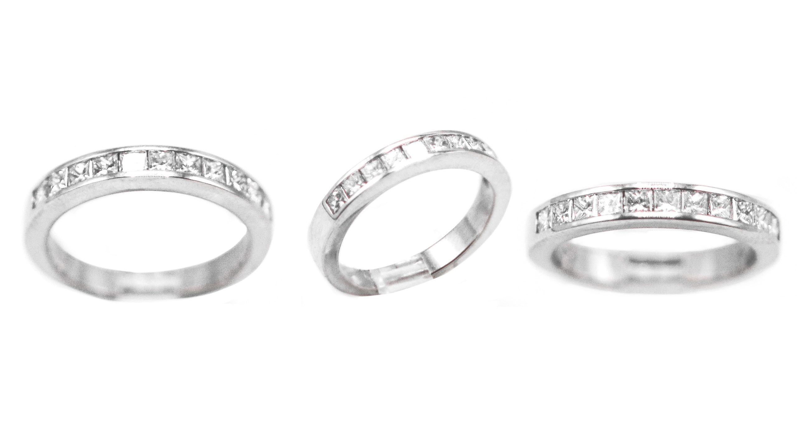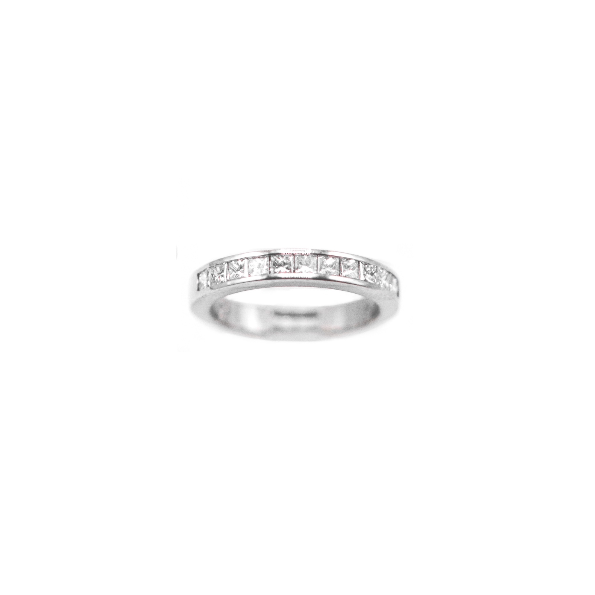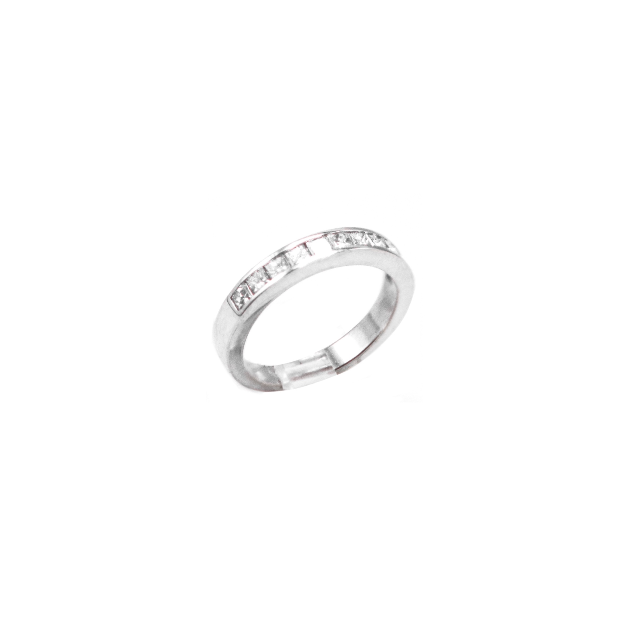 Este anillo medio cintillo en riel, elaborado con precisión y sofisticación, presenta nueve diamantes corte princesa que se alinean perfectamente, creando un camino de luz y elegancia. Cada diamante, con su brillo incomparable, simboliza los momentos únicos y preciosos de su historia juntos. El diseño en riel asegura que cada gema esté perfectamente en su lugar, reflejando un amor que es fuerte y duradero. Este anillo es ideal para quienes desean una pieza de joyería que combine modernidad y tradición, convirtiéndose en un símbolo atemporal de compromiso y amor eterno.