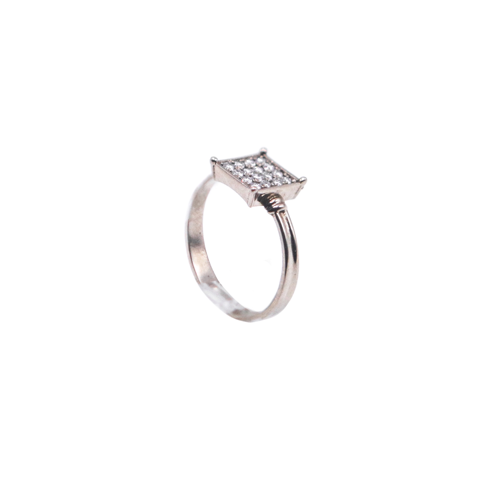 Este anillo de oro blanco combina modernidad y lujo en un diseño verdaderamente impresionante. La placa central de forma cuadrada está magistralmente engastada con 16 brillantes diamantes, creando un resplandor uniforme y cautivador. Cada diamante ha sido cuidadosamente seleccionado y dispuesto para maximizar su brillo, ofreciendo un destello de elegancia en cada ángulo. El contraste entre la suavidad del oro blanco y el destello de los diamantes hace de este anillo una pieza única, ideal para aquellos que buscan un símbolo de compromiso que sea audaz, contemporáneo y lleno de sofisticación. Un reflejo perfecto de un amor que es fuerte y brillante.