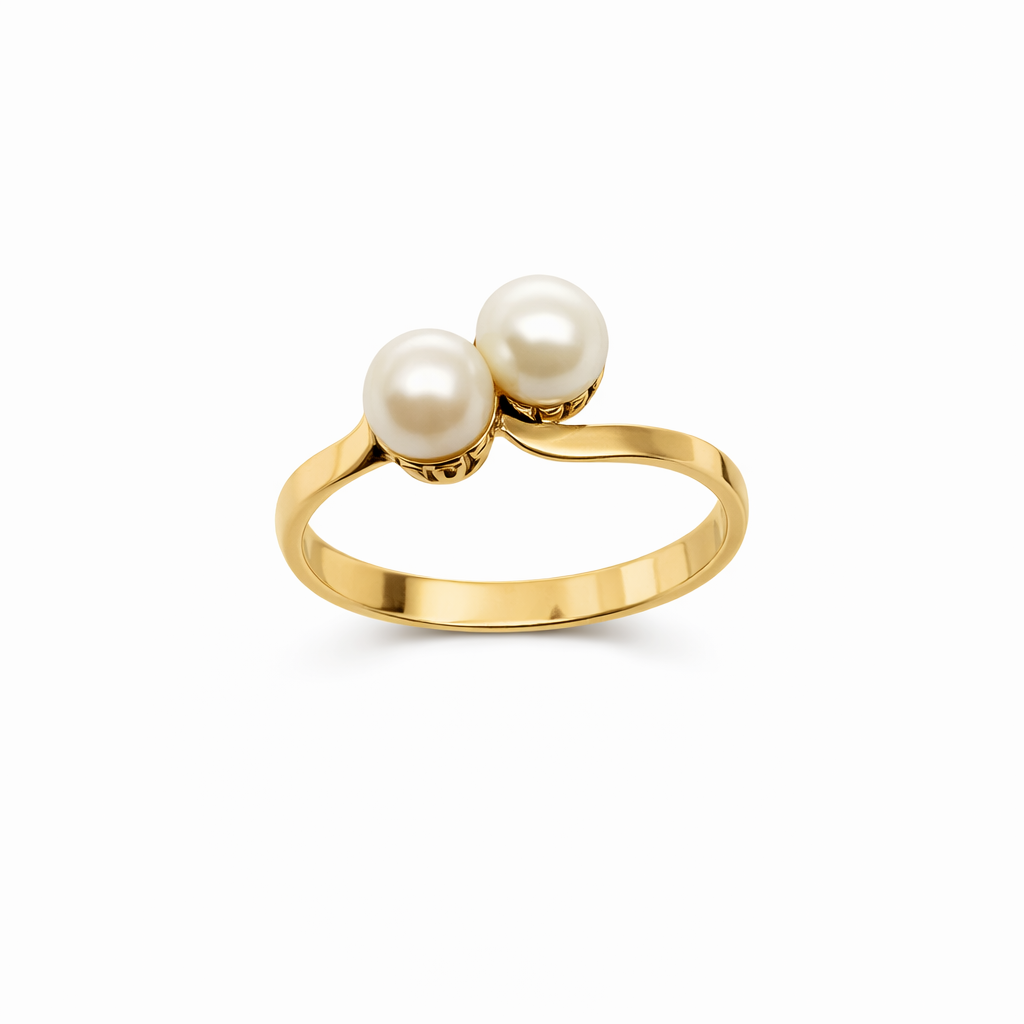 Anillo Tu y Yo de oro amarillo con perlas japonesas blancas, elegante y de delicado simbolismo.