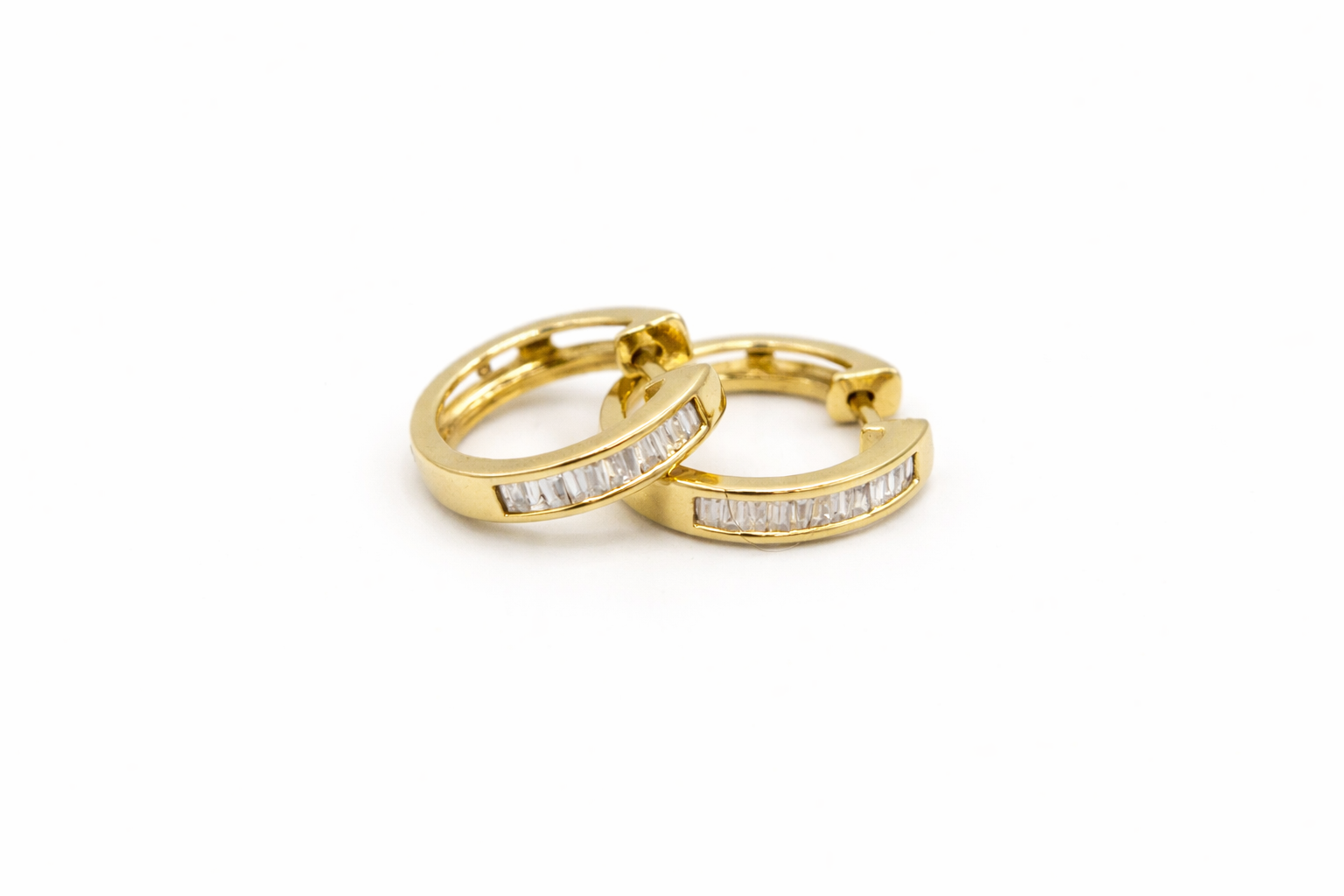Estos aros argolla pertenecen a una selección de joyería Italiana de alta calidad y están elaborados en oro amarillo con diamantes corte baguette cuidadosamente engastados, con un peso de 3,4 gr y un tamaño de 17 mm, destacan por su diseño refinado y luminoso. Su forma compacta y acabado pulido ofrecen comodidad, sofisticación y un estilo elegante, ideal para ocasiones especiales o uso diario distinguido.
