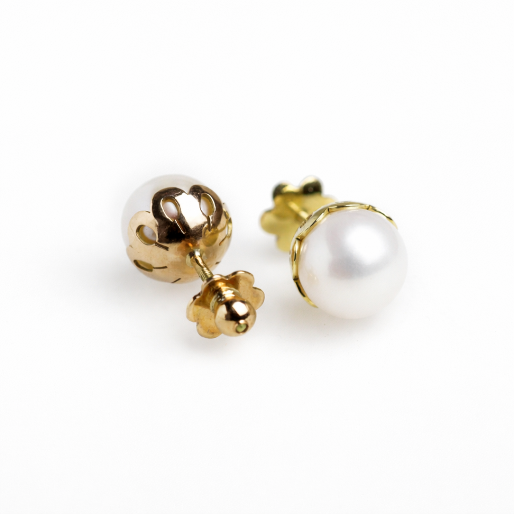 Aros en oro amarillo con perla japonesa blanca, diseño clásico y acabado artesanal.