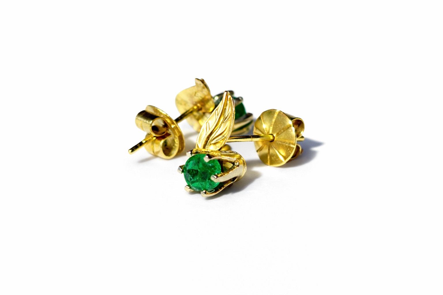 Aros elaborados en oro miel, con un diseño delicado que incorpora detalles inspirados en formas naturales. Cada aro presenta una esmeralda colombiana de 4 m.m cada piedra es de 0,25 quilates y están cuidadosamente engastada para realzar su color verde intenso. Con un peso total de 2 gramos, ofrecen ligereza, equilibrio y terminaciones pulidas de alta calidad.