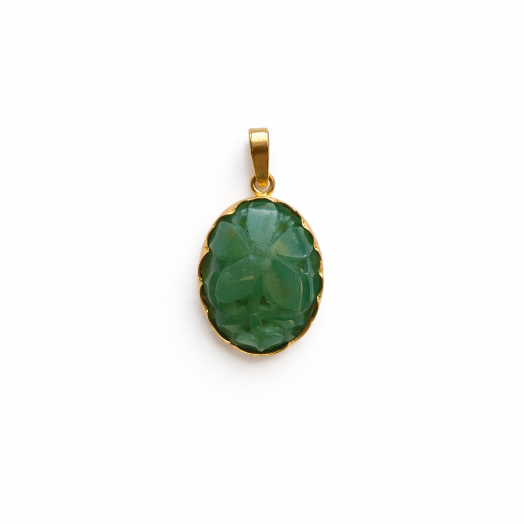 Colgante camafeo de flor en piedra jade y oro miel, pieza exclusiva de acabado refinado.