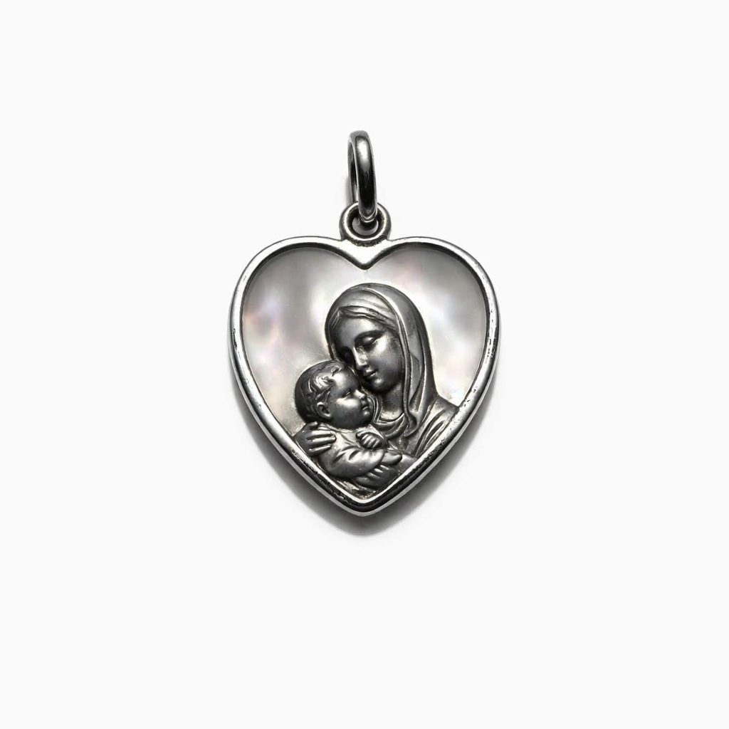 Medalla de la Virgen con Niño Jesús elaborada en plata con fondo de nácar, diseño elegante, ideal para regalo.